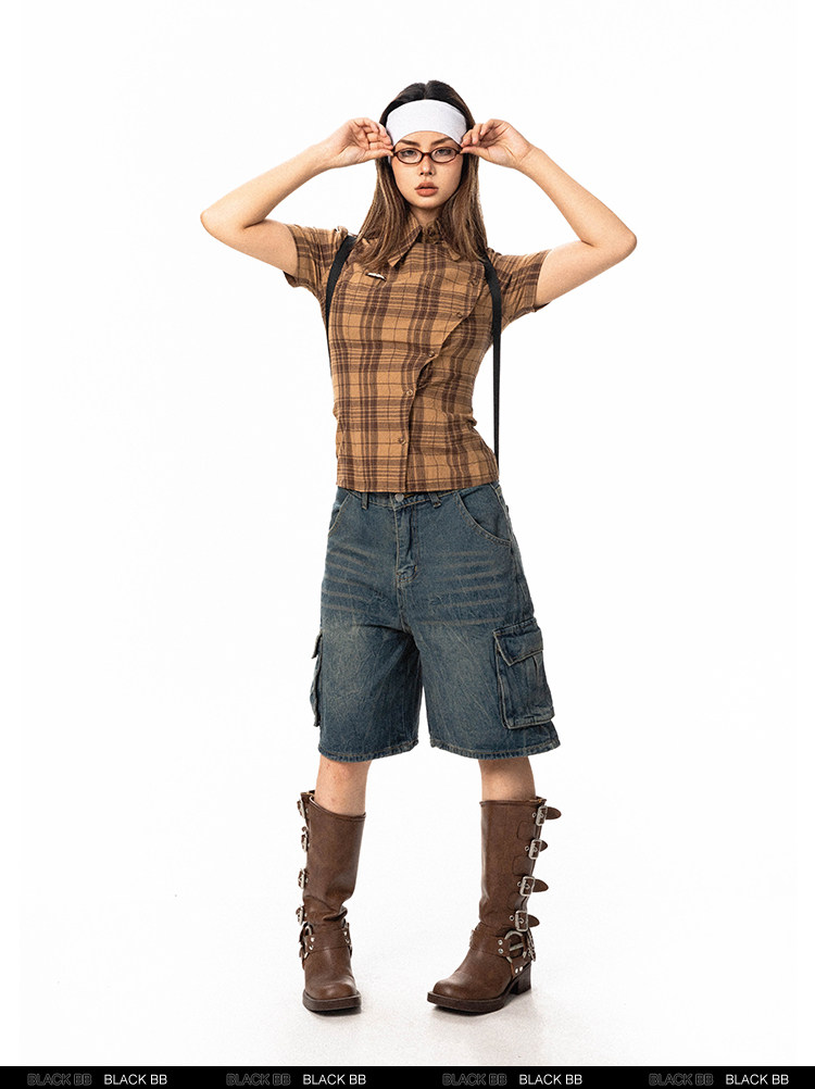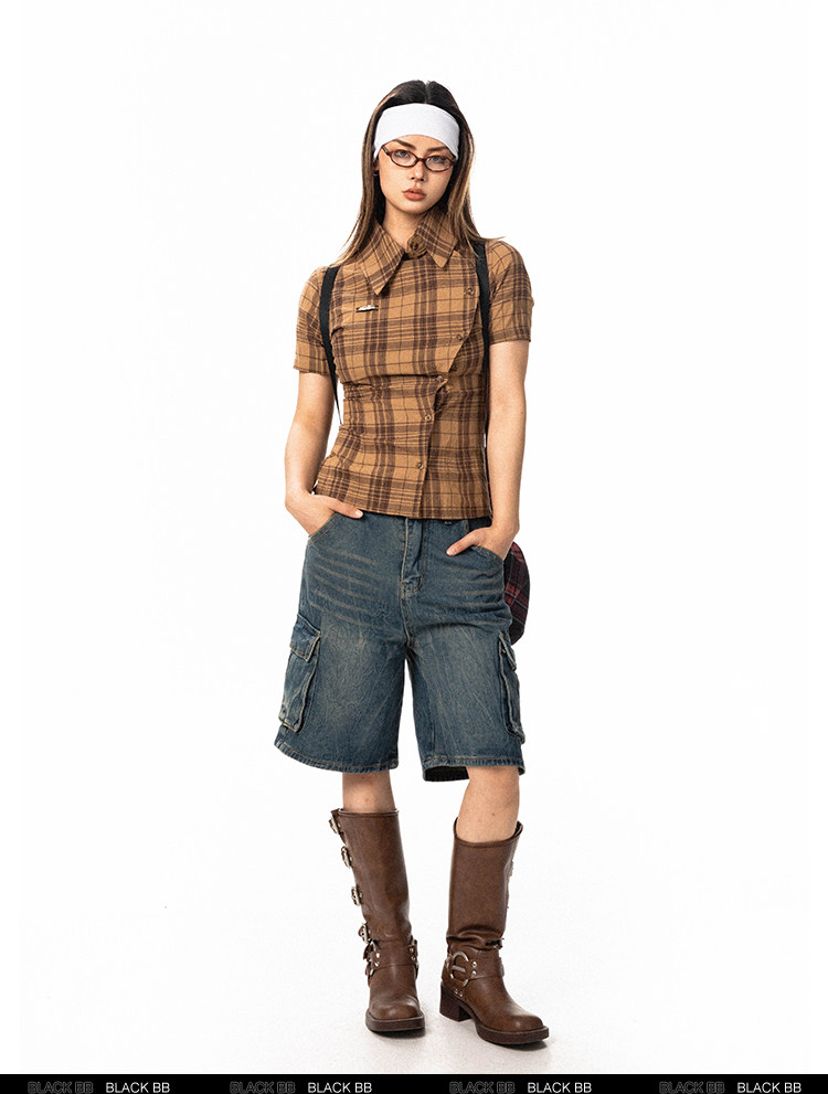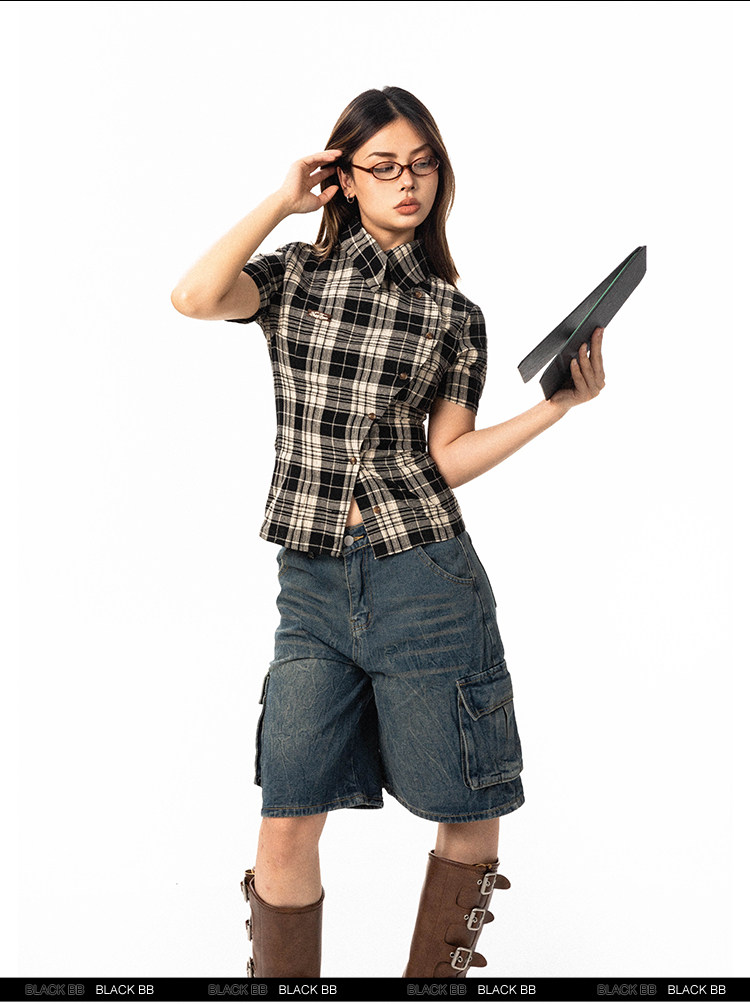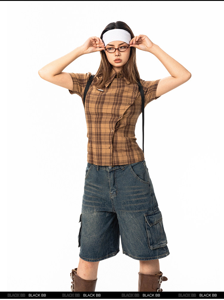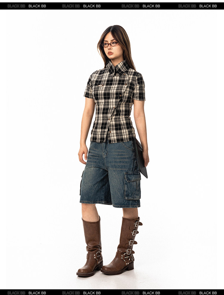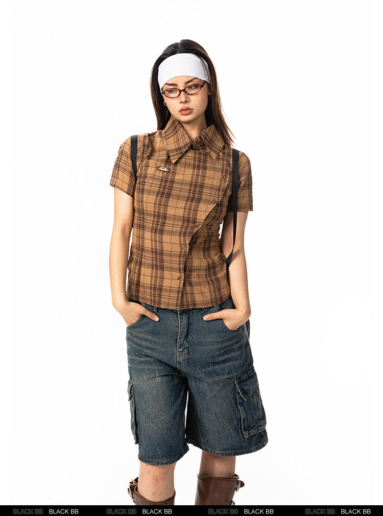 Pre-loved Diagonal Placket Check Skinny Shirt Slim Fit Tee