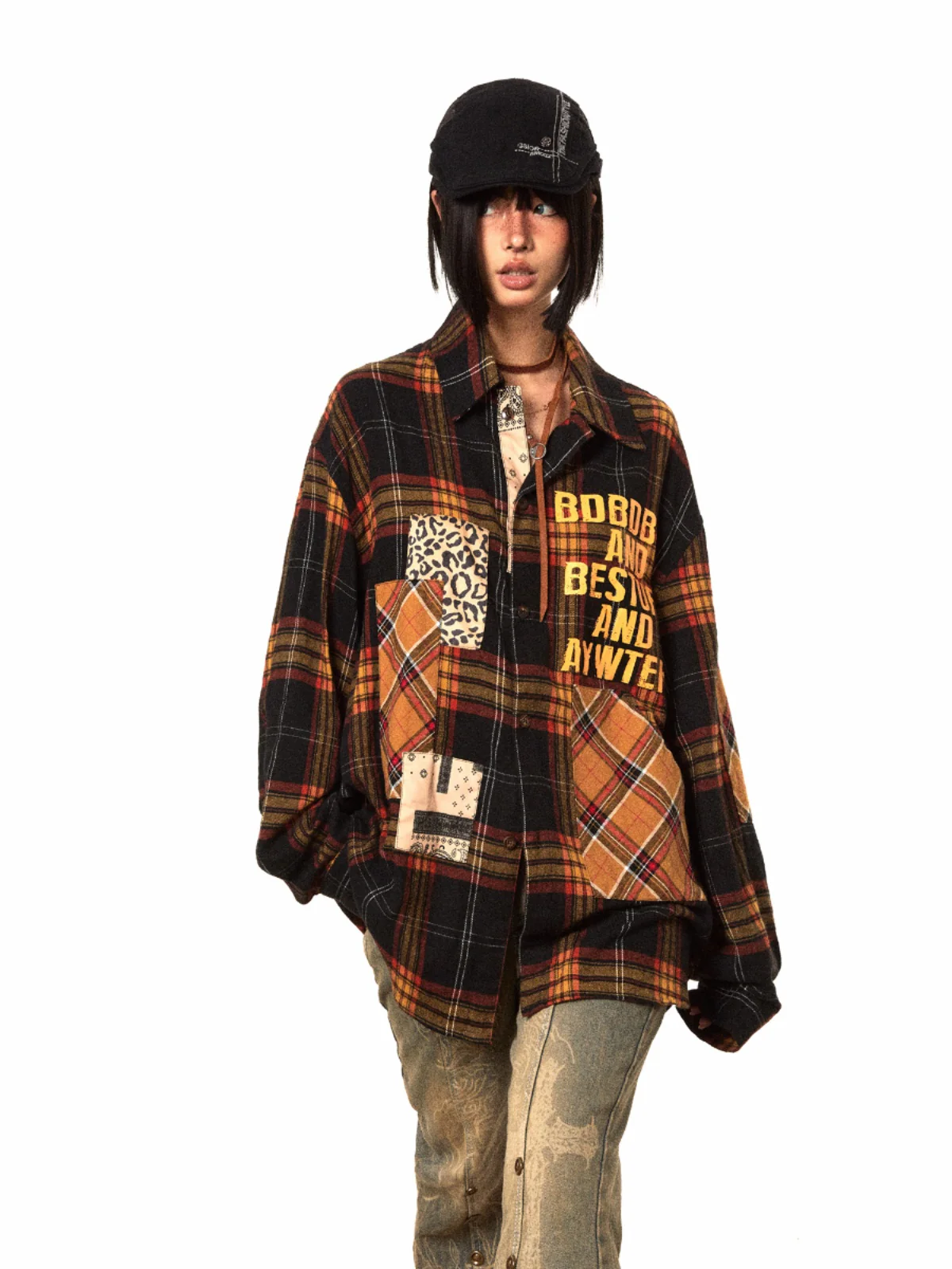 BLACKBB Retro Elements Patch Print Plaid Long Sleeve Shirt